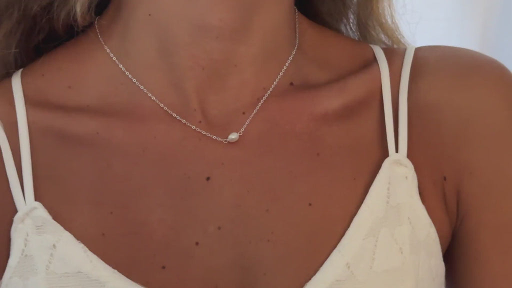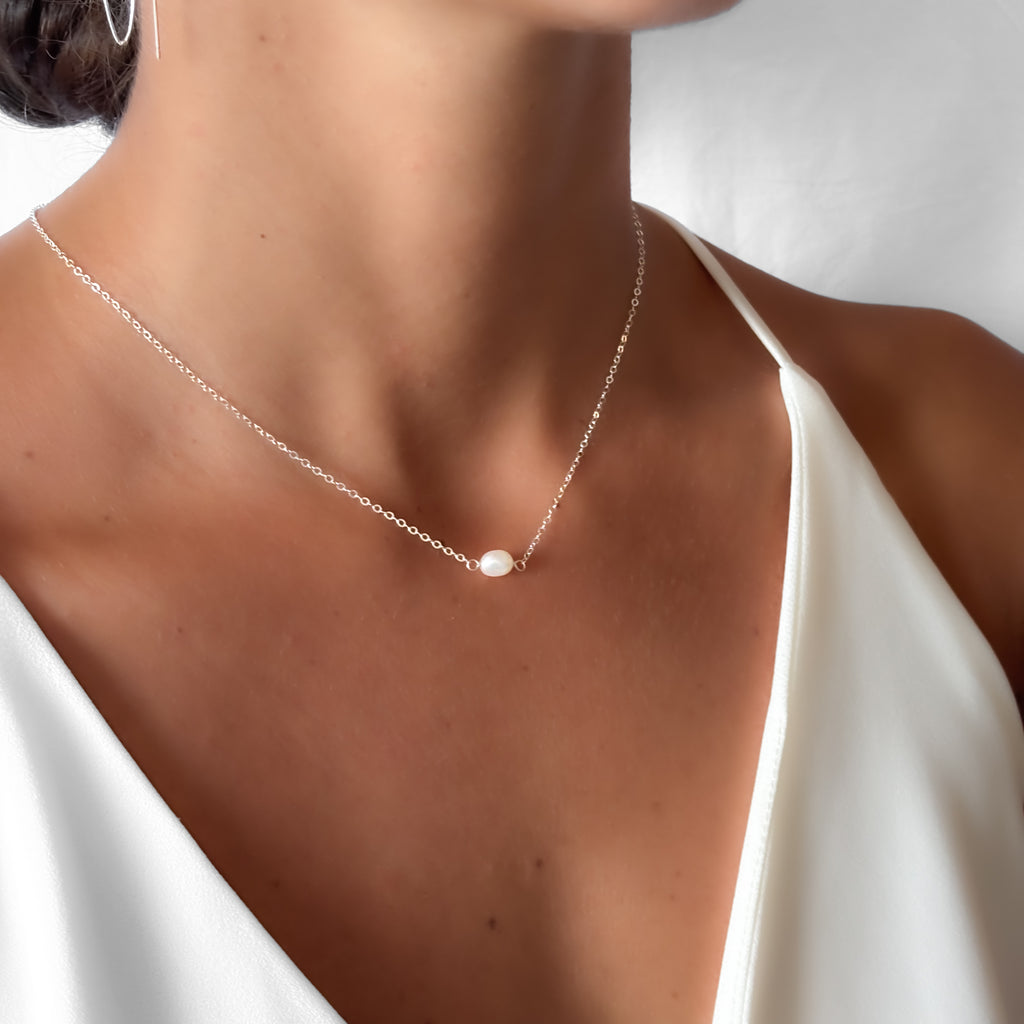 This minimalist sterling silver necklace showcases a luminous freshwater cultured pearl lying horizontally, resting perfectly against your neckline for a chic, effortless look.